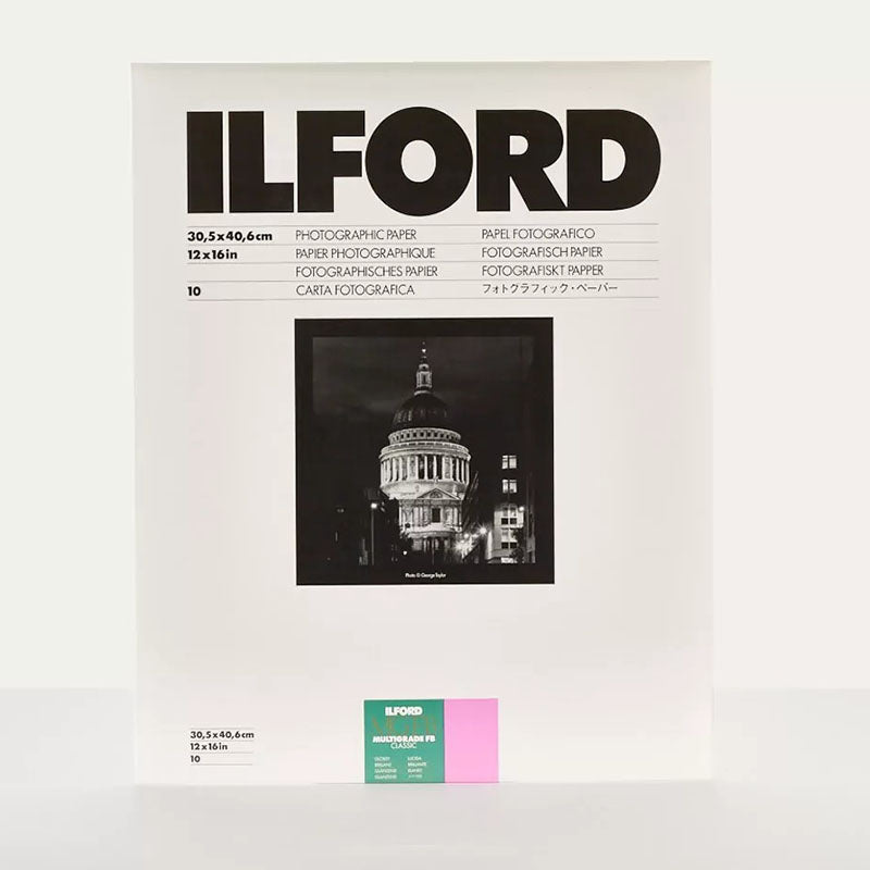 ILFORD MULTIGRADE FB CLASSIC is a premium quality, variable contrast, black and white photographic paper on a heavyweight baryta coated, fibre base. It is designed for creative printers wanting neutral image tone, great clarity and a good response to toners. Versatile and easy to use, this paper creates rich deep blacks and has excellent tonal rendition. MULTIGRADE FB CLASSIC responds well to toning, chemical reduction and retouching techniques, particularly on the glossy surface. MULTIGRADE FB is also available in Cooltone and Warmtone variants and is compatible with the ILFORD optimum permanence wash sequence. MULTIGRADE FB CLASSIC is part of the ILFORD MULTIGRADE system and seven full grades of contrast can be achieved when used with ILFORD MULTIGRADE filters. It can be used with most common safelights for black & white darkroom paper such as the ILFORD 902 safelight filter.