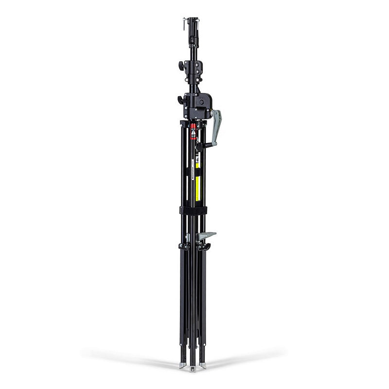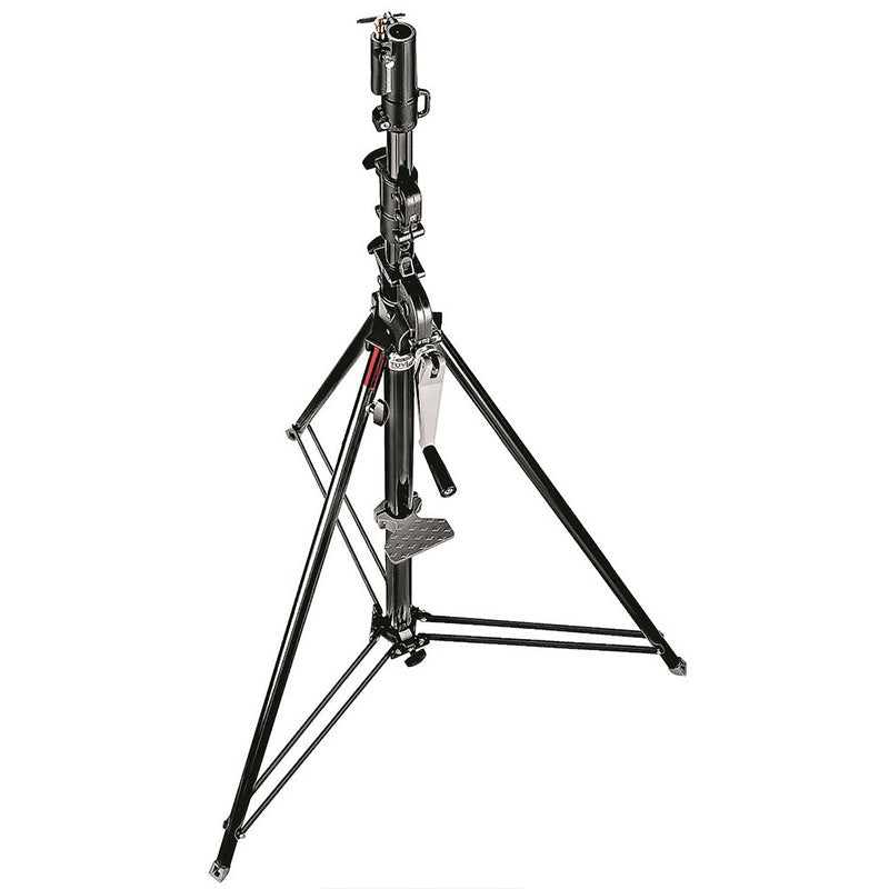 The 12' Manfrotto Wind-Up Stand is a black, chrome-plated steel stand with geared column and one leveling leg. Rugged and heavy duty, it combines the strength, stability and portability that are required by today's demanding professionals. Like all Bogen cine-style stands, it features a Universal Mount which has both a 1-1/8" Junior and 5/8" Baby receiver as well as a 5/8" Baby stud.