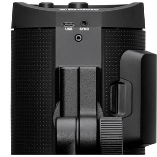 The rubberized surface and compact 11×25.5×11cm design ensures secure handling with heavy modifiers while remaining 70–200mm lens-sized for easy transport. Profoto B-Series 4S1P batteries provide 220 full-power flashes per charge with a 90-minute charging time.